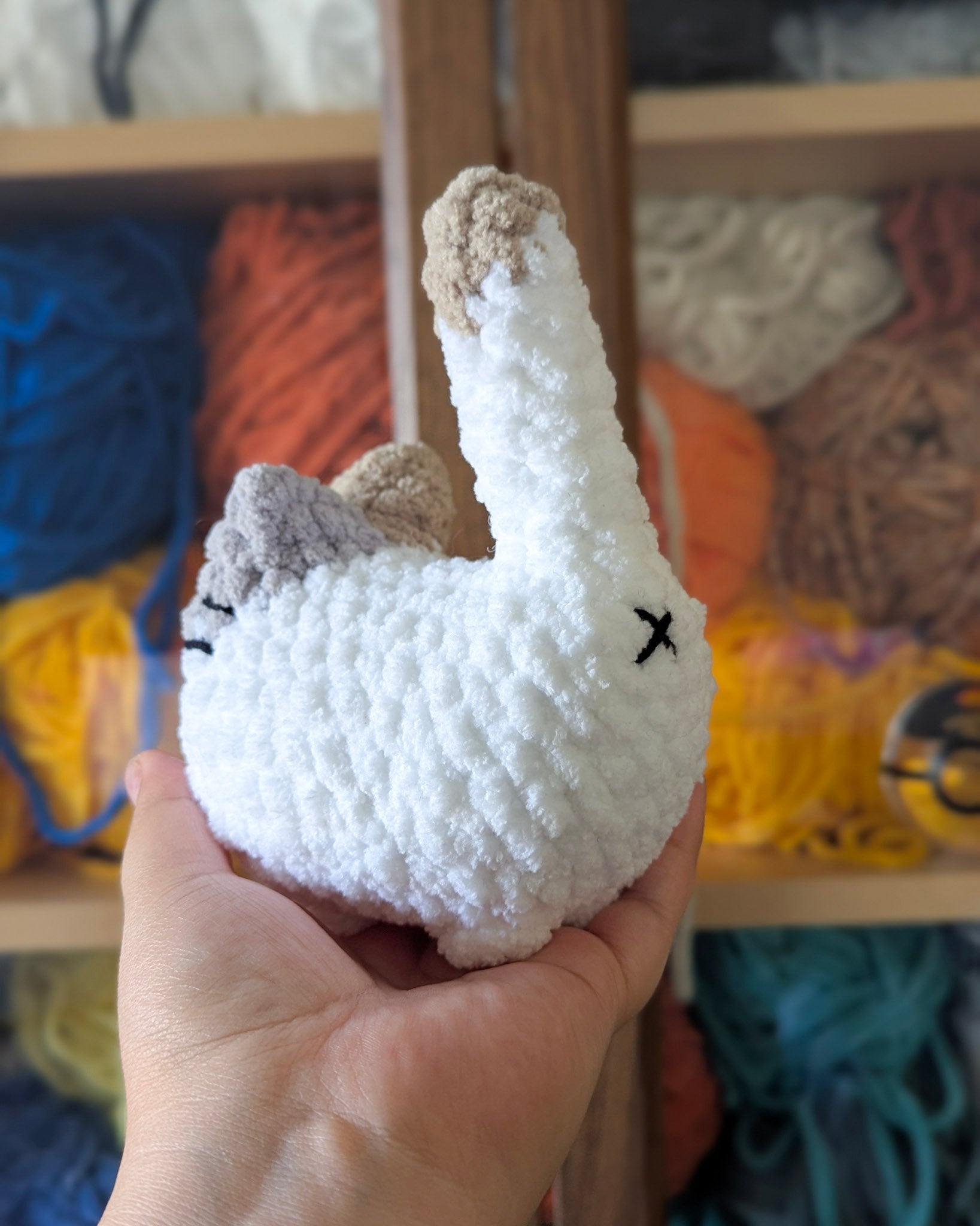 - Diluted Calico: White cat with light grey and light tan spots on the tail and one grey ear with one tan ear. Finished with black embroidered mouth, whiskers, and butt hole.