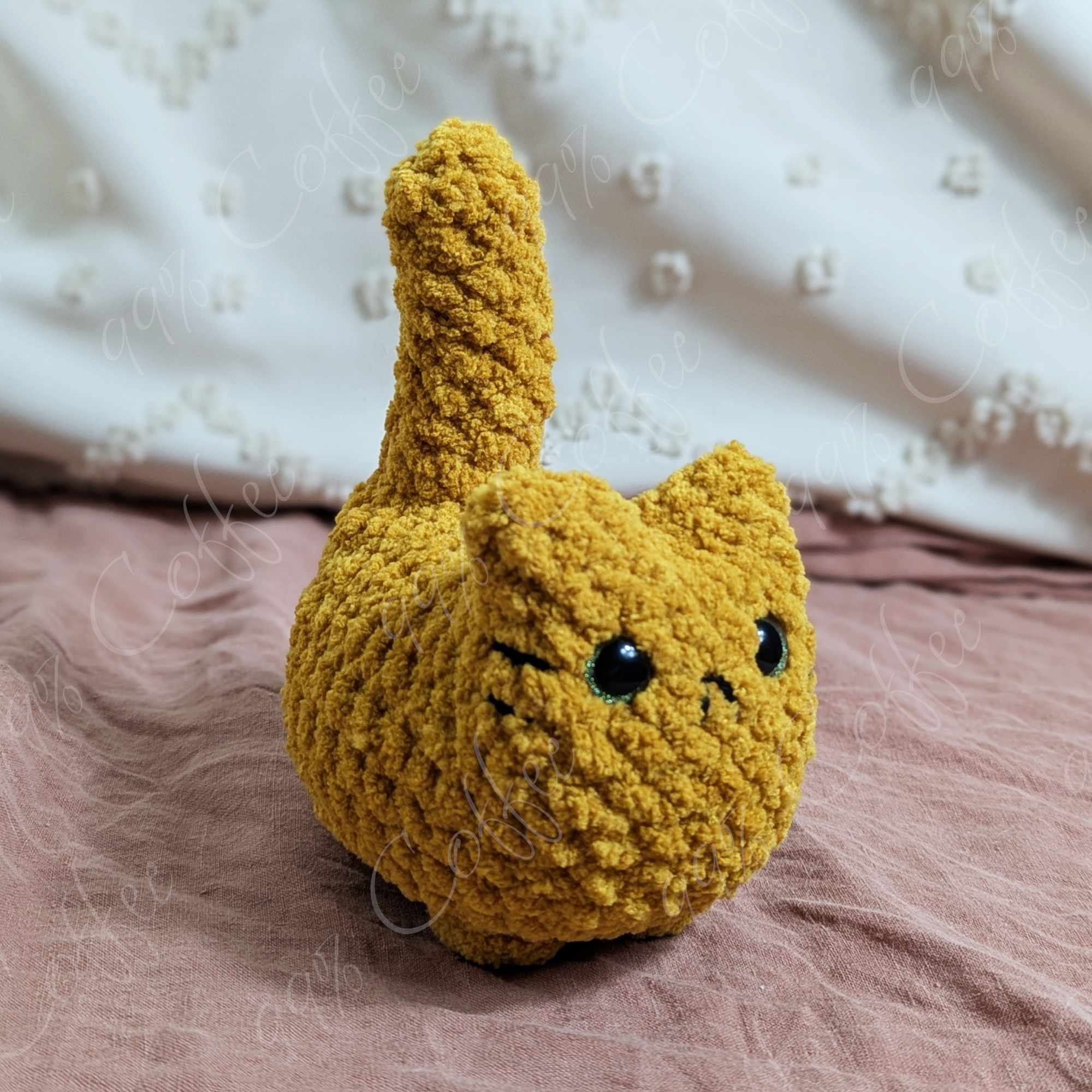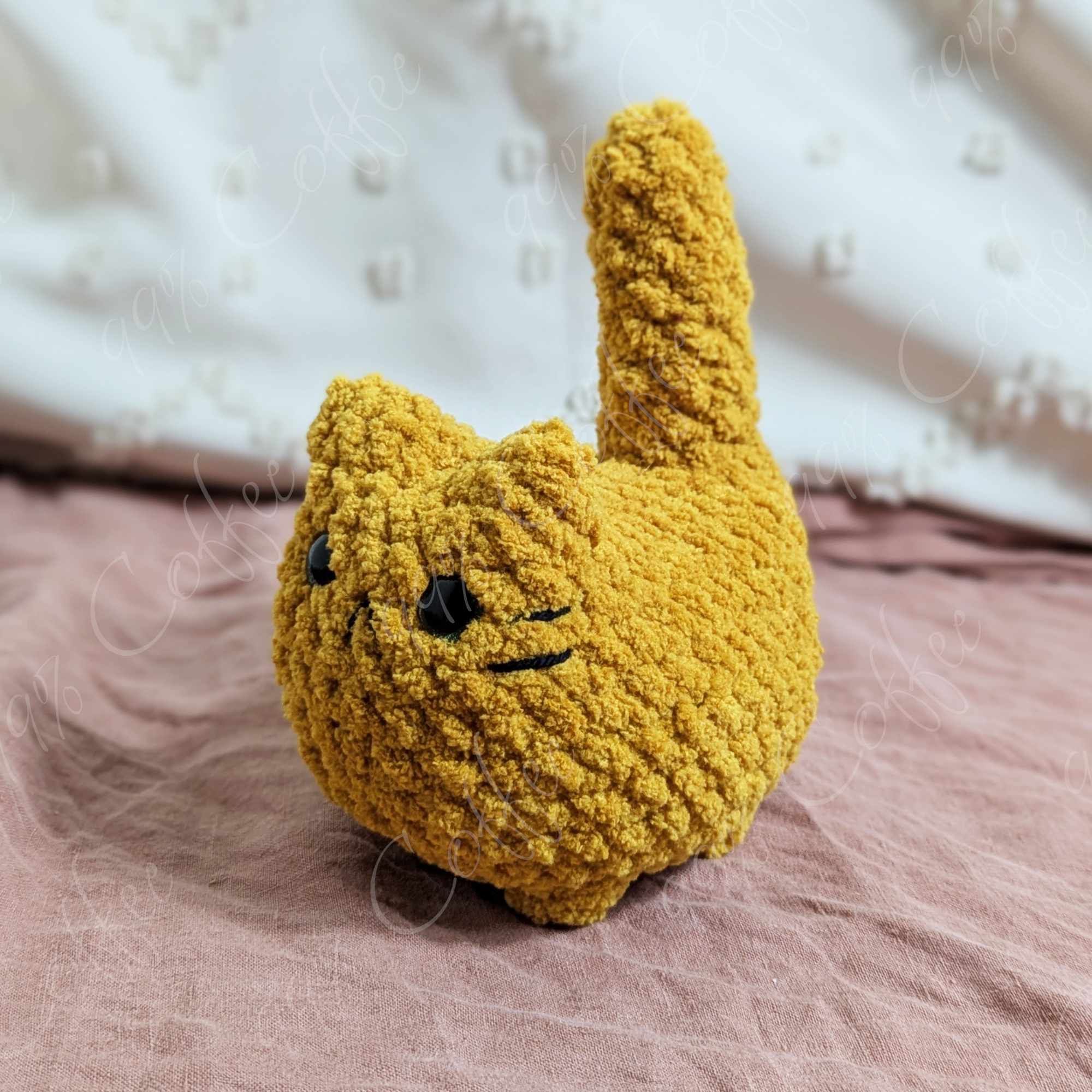 - Orange: Mustard yellow cat. Finished with black embroidered mouth, whiskers, and butt hole.