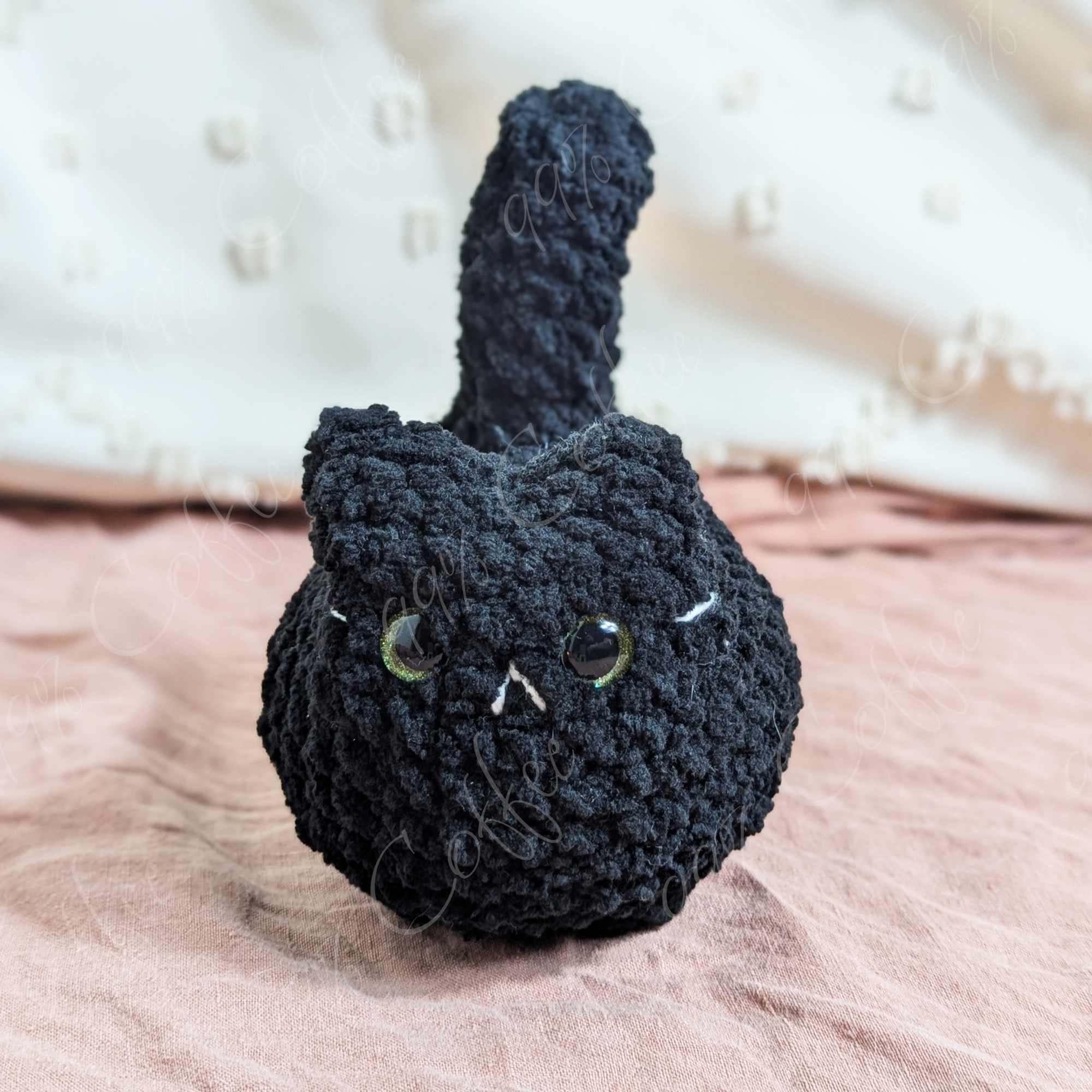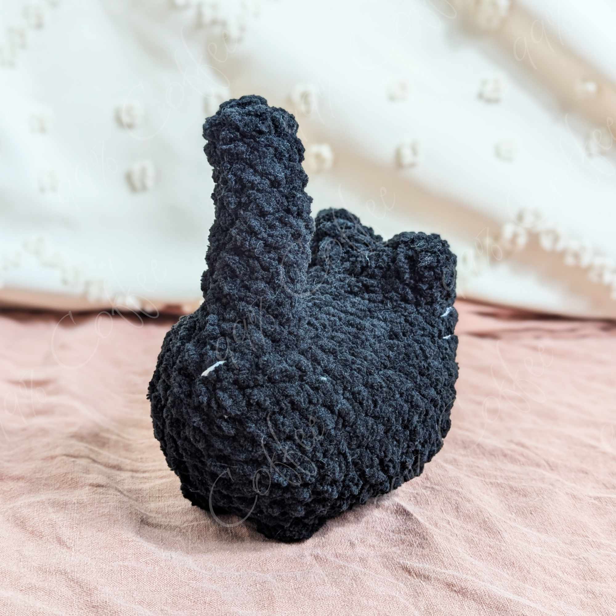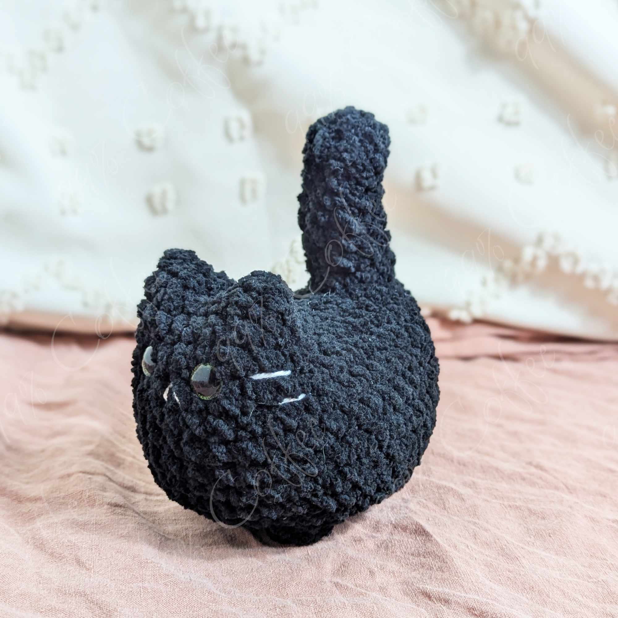 - Black: Black cat. Finished with white embroidered mouth, whiskers, and butt hole.