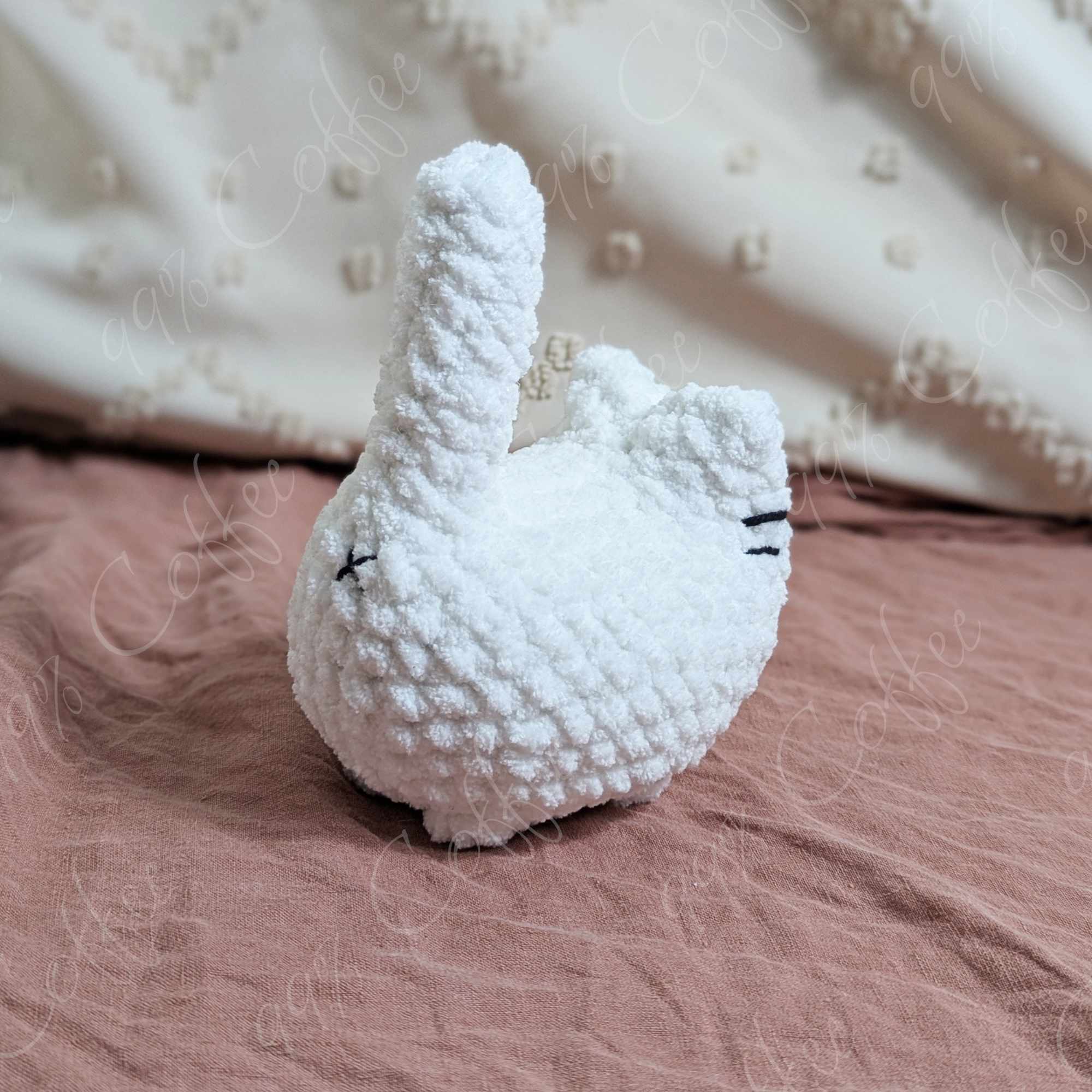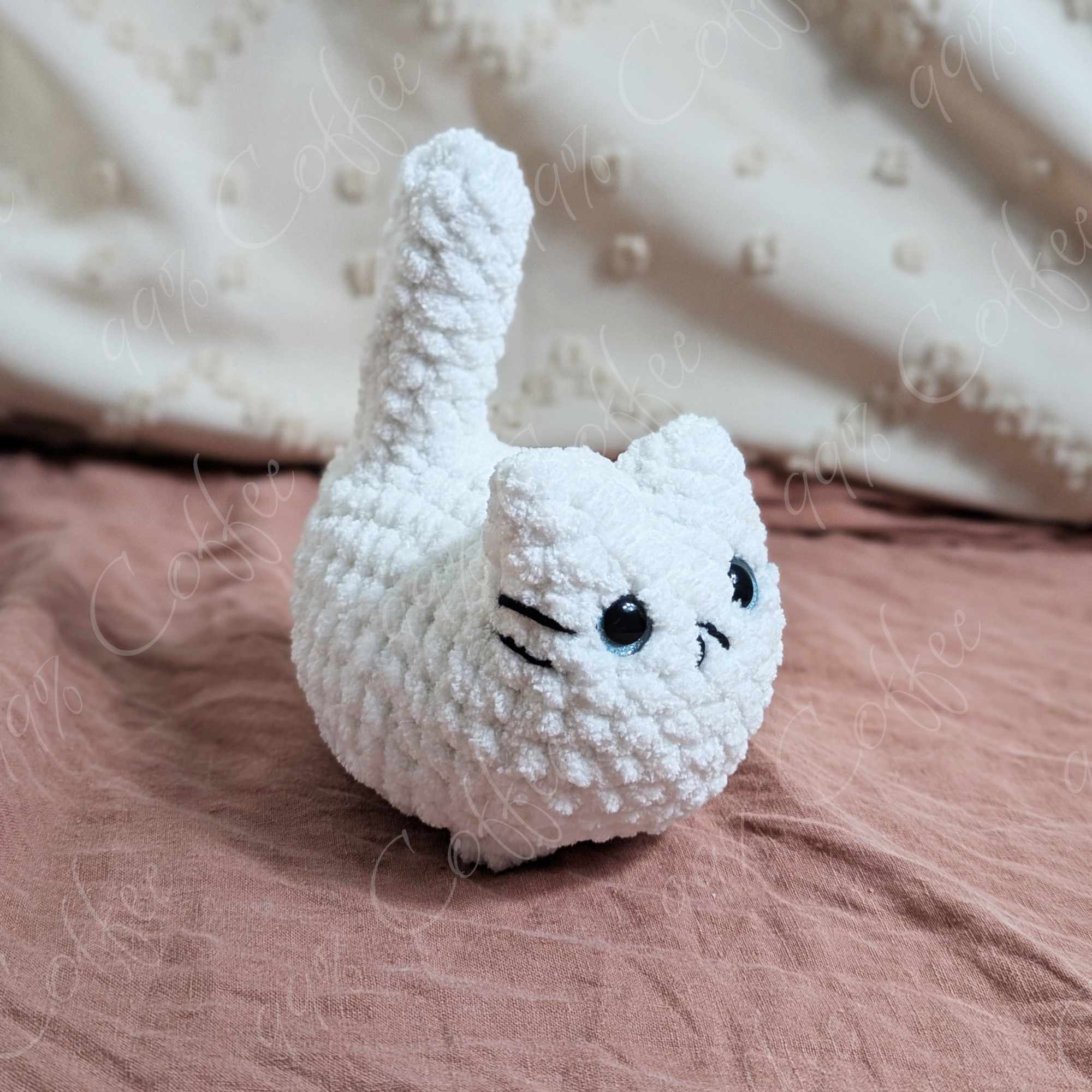 - White: Bright white cat. Finished with black embroidered mouth, whiskers, and butt hole.