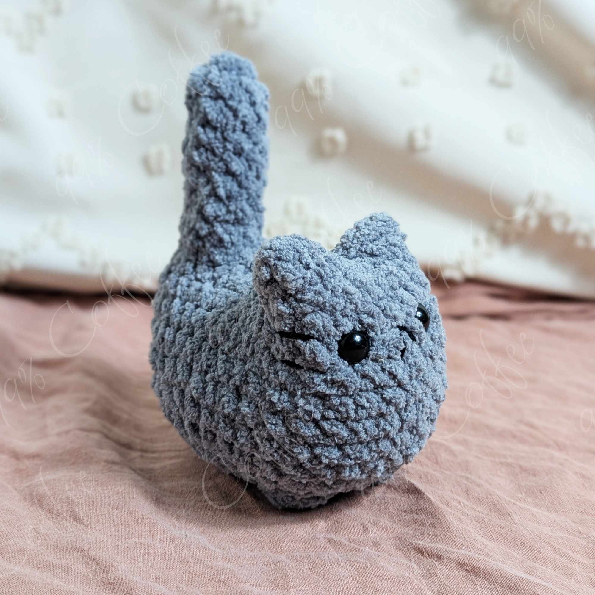 - Grey: Dark grey cat. Finished with black embroidered mouth, whiskers, and butt hole.