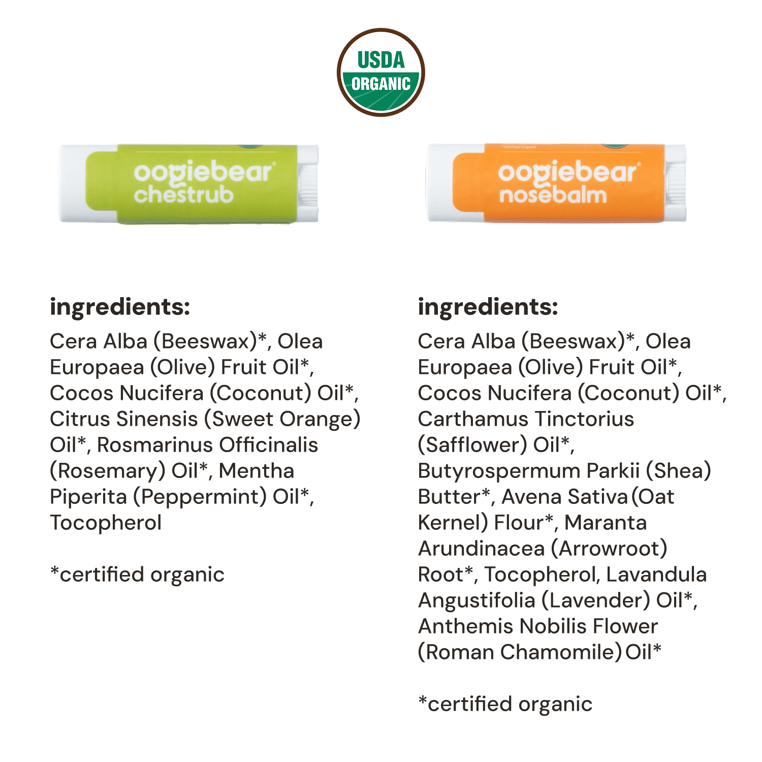 Nose Balm Ingredients: Cera Alba (Beeswax)*, Olea Europaea (Olive) Fruit Oil*, Cocos Nucifera (Coconut) Oil*, Carthamus Tinctorius (Safflower) Oil*, Butyrospermum Parkii (Shea) Butter*, Avena Sativa (Oat Kernel) Flour*, Maranta Arundinacea (Arrowroot) Root*, Tocopherol, Lavandula Angustifolia (Lavender) Oil*, Anthemis Nobilis Flower (Roman Chamomile) Oil*